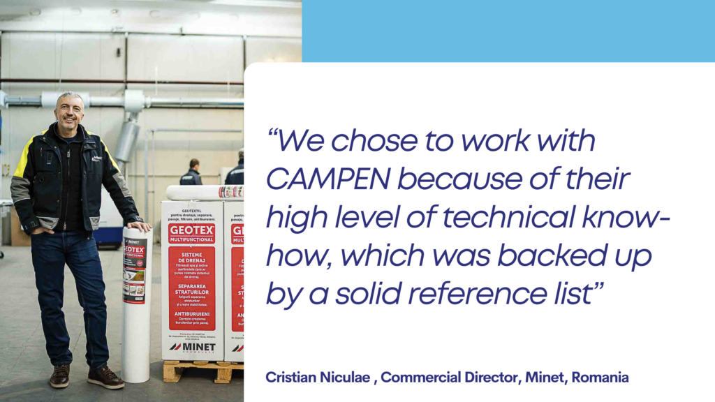 They found the perfect solution at CAMPEN Machinery A/S. “We chose to work with CAMPEN because of their high level of technical know-how, which was backed up by a solid reference list. Also, they were able to cut the nonwoven in sheets on the same line, which was an important requirement for us,” Cristian Niculae, Commercial Director of Minet, explains.