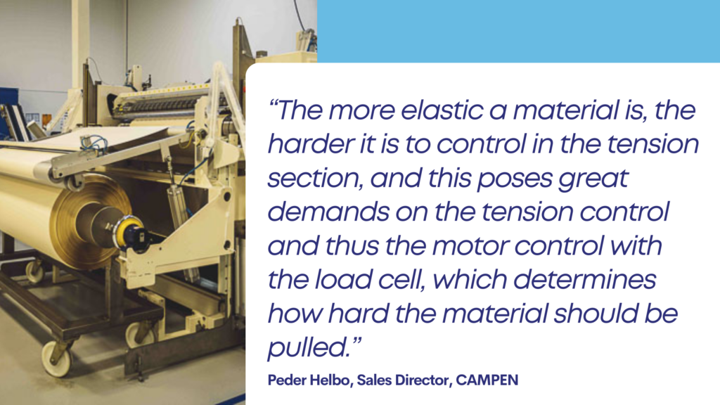 Peder Helbo, CAMPEN’s Sales Director, highlights CAMPEN’s expertise in cutting systems and tension control, which has been crucial in the successful implementation of these machines. He further notes that: “The more elastic a material is, the harder it is to control in the tension section, and this poses great demands on the tension control and thus the motor control with the load cell, which determines how hard the material should be pulled.”